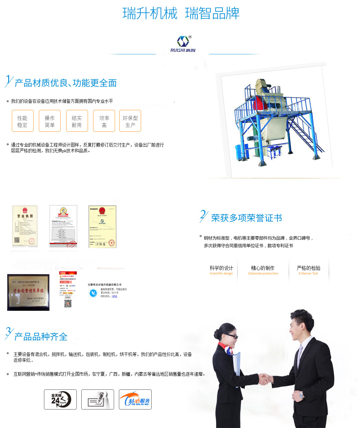 安徽瑞升機械制造有限公司坐落在明光市工業(yè)園區(qū),本公司產(chǎn)品主要用于粉料物質(zhì),顆粒物質(zhì)的混合、攪拌、輸送、包裝的自動化生產(chǎn)設備。工廠占地面積為1萬多平方現(xiàn)有6000平方米的生產(chǎn)車間和各類加工檢測設備,具備產(chǎn)品開發(fā)、研制、設計、生產(chǎn)、試驗、倉儲運輸?shù)饶芰Γ梢陨a(chǎn)多種規(guī)格、多種非標定制的產(chǎn)品,并有多項技術(shù)獲得國家專利,擁有自主進出口權(quán),公司憑借優(yōu)良的技術(shù)、先進的工藝和科學的管理理念,所生產(chǎn)的產(chǎn)品已暢銷全國各地,部分產(chǎn)品已進入馬耳他、印度尼西亞、韓國、羅馬尼亞、沙特阿拉伯、馬來西亞、印度、巴基斯坦、等國家和地區(qū),受到國內(nèi)外客戶的高度認可和信賴。 本公司獲得守合同重信用單位證書,對原材料的采購極為細致,鋼材為標準型,電機等主要零部件均為品牌,數(shù)項專利證書。技術(shù)方面我司擁有一支國內(nèi)的技術(shù)和管理團隊,在機械設備應用...公司資質(zhì)榮譽